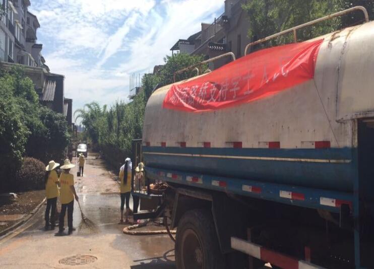 7月6日,烈日當(dāng)空,酷熱難耐,湘江長沙段剛退出警戒水位,一支由湖南路橋通泰公司長韶婁東延項(xiàng)目組成的支援災(zāi)后重建隊(duì)伍正在對(duì)含浦片區(qū)內(nèi)的汀湘十里、江山帝景等小區(qū)進(jìn)行地面沖洗、清淤、消毒等工作。