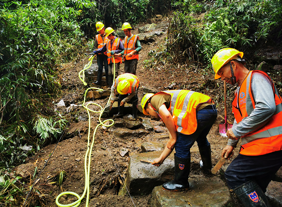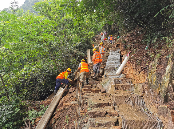 可即便施工環(huán)境如此艱苦,他們也未曾對(duì)施工質(zhì)量放松一絲一毫的要求。剛進(jìn)場時(shí),有一次工人們?cè)谔莸朗┕さ胶蟀胍?,才完成了?dāng)天三十余米的施工任務(wù)。但沒想到,第二天一早工人到現(xiàn)場,才發(fā)現(xiàn)因天黑看不清楚,昨夜修好的梯道不夠美觀,于是他們二話不說,將梯道拆了重新施工,達(dá)到要求才罷休。