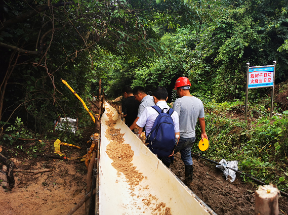 湖南路橋副總經(jīng)理?xiàng)畲簳?huì)駐扎項(xiàng)目一線,與現(xiàn)場管理人員一起,貫徹集團(tuán)黨委“就地取材、因陋就簡、生態(tài)環(huán)保”的十二字方針想辦法、想措施。經(jīng)過多方研討,攻堅(jiān)小組創(chuàng)新提出了新型運(yùn)輸方法——溜槽。即在施工沿線搭建凹槽,并在山頂架設(shè)一臺(tái)拌和機(jī),使混凝土順著凹槽溜下,以滿足沿線施工需求。